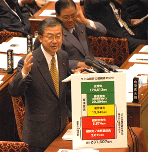 小泉内閣は、個人消費の低迷で株価を減少させるという「デフレ」要因を増大させています。これで、銀行経営の環境を悪化させる一方、「竹中プラン」で銀行の査定を厳しくする。こうして内と外から銀行を追い込んでいます。