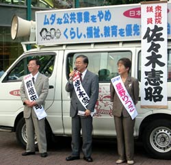 四日市駅前では、街頭宣伝をおこないました。私は、ムネオハウス追及の体験をお話ししながら政治腐敗を根絶すること、これ以上の増税や負担増に反対し財政構造の改革をすすめること、自衛隊の海外派兵をくい止めること、そのためにも日本共産党の躍進をと訴えました。