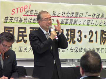 日本共産党の市田忠義書記局長が、連帯の挨拶を行い、増税反対の1点で共同を広げようと呼びかけました。