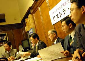<うえの写真=向かって左端が日本共産党の「リストラ反対・雇用を守る闘争本部」事務局長の山下さん。その右が、党国会議員団の「リストラ・不況対策委員会」委員長代理の小沢さん、委員長の吉井さん、事務局長の塩川さん、その右が私>