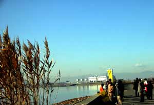今日は朝から晴天に恵まれ、藤前干潟にいって「藤前ラムサール女性の会」の方々の説明を聞き写真をとりました。冬は、潮が満ちている時間が長く、この時間にはシギやチドリはいませんでしたが、遠くにカモ類が見えました。