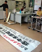 <これに先立ち、日本共産党の東海ブロック事務所でカエルネットのみなさんが横断幕の準備>