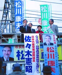 「市民の市政をつくる会」の市長候補の松川康夫さんは、海の環境をまもるためにがんばってきた海洋学者です。松川さんの演説は、じつに力強くたのもしい候補者です。