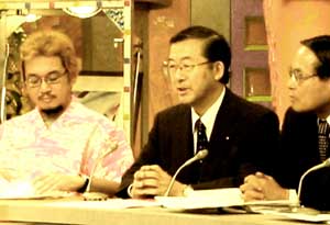 <右が平沢議員、左端が漫画家のやくみつるさん>