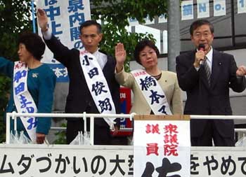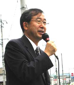 橋本マサ子市議、和田まゆみさん、小田俊朗さんの3人が、8月25日投票でおこなわれる名張市議選に向けて、力強い訴えをおこないました。