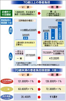 医療改悪法では、サラリーマンや公務員本人の窓口負担は、来年4月から3割に引き上げられます(現行は2割負担)。会社や役所を退職した年金生活者(退職者医療制度)も3割負担に。家族が入院したときの負担も、3割に上がります。70歳以上のお年寄りについては、ことし10月から患者負担増が実施されます。多くの診療所で実施されている1回850円(月4回まで負担、5回目からは無料)の定額負担制は10月から廃止され、1割負担が徹底されます。