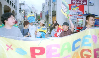 <「ストップ、ストップ、有事法制!」と行進する青年たち=8日、福島・郡山市「赤旗」HPより>