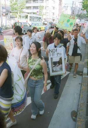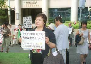 神奈川県の戸谷加奈子さん(26)は「これ以上9・11はいらない」と、イラク攻撃などの動きに抗議。「自衛隊の海外派兵、有事法制に反対です。国民が戦争に駆り出され、殺される子どもたちを考えてほしい」。彼女の訴えに12人が賛同して米大使館前に集まりました。