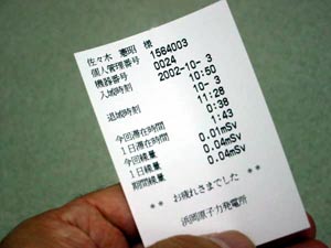 私があびた放射線は、3号機で0.03ミリ・シーベルト、2号機で0.01ミリ・シーベルト、あわせて0.04ミリ・シーベルトでした。一応、基準以内におさまりました。