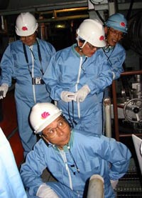 ここでは、再循環系配管のひび割れ場所を確認しました。放射線が強いため2分間程度しかその場所にいることができません。ひび割れカ所は、配管のなかにあるためキズそのものは見ることができませんが場所確認し、超音波でどのようにして検査するかの説明を受けました。