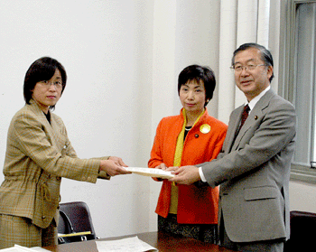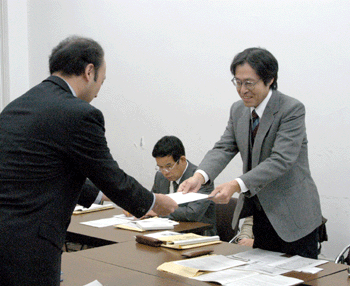 <福島委員長(右)から文部科学省に「要求書」を手渡す>
