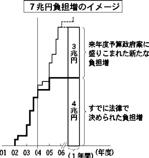 その結果、来年度予算案に盛り込まれた国民負担増は、3年後の2006年度に年間約3兆円になる計算です。