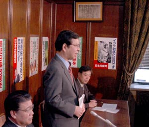 国民大運動・安保破棄中央・中央社保協・有事法制許さない連絡センターの主催で、イラク派兵を許すな、年金改悪反対の昼休みデモがおこなわれ、日本共産党国会議員団が激励しました。