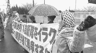 明日は、イラクへ支援物資などを空輸する航空自衛隊のC130輸送機3機が、隊員約40人を乗せて愛知県の小牧基地からクウェートに向け出発する予定です。<“人間の鎖”でイラク派兵に抗議する参加者=17日、愛知県小牧市空自小牧基地正門前(「赤旗」より)>