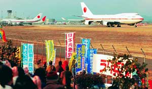<イラク派兵反対の抗議のなか、航空自衛隊派兵本隊を乗せ出発する政府専用機。左は予備機=1月22日、愛知・名古屋空港(「赤旗」より)>