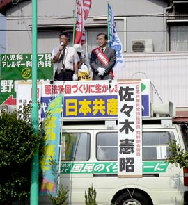 最初のショッピングセンター前では、5人くらいのお年寄りが暑い中を聞いてくれていました。買い物に来ていた若い主婦が最初から最後まで、じっと聞いていました。ビラとマニフェストを真剣に読んでいました。