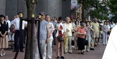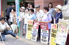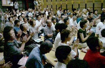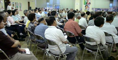 富山市内の豊田にある蓮照寺では、会場の本堂に入りきらないくらいの180人が参加しました。TVカメラもきていました。雨が降って足元も悪く、クーラーもないところで、蒸し暑かったですが大盛況でした。