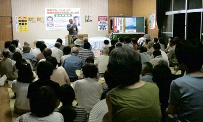 高岡本丸会館は、100人くらいの参加者で、盛況でした。上田俊彦候補といっしょにお話をしました。