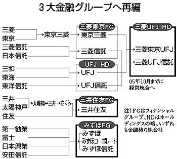すでに、UFJホールディングスと三菱東京フィナンシャル・グループが、統合に向けた基本合意書を締結し、2005年10月1日をめどに、両持ち株会社と傘下の銀行、信託銀行、証券会社がいっせいに合併するとしています。