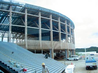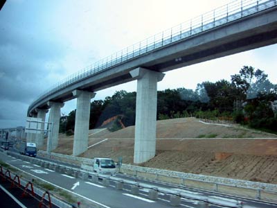 会場に近づくにつれ、リニアモーターカーが走る路線と支柱が目に入ります。まさに、ゼネコン中心の土木工事そのものです。