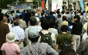 こう話をすると、「そうだ」「そのとおり」の掛け声がかかりました。また、立ち止まって聞いていく人が何人もいました。また、近くの400年続いている老舗のおばあさんが出てきて、最後まできいてくれました。ありがとうございます。