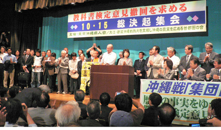 今日夜、国会近くの星陵会館で開かれた東京沖縄県人会・沖縄戦首都圏の会主催の「教科書検定意見撤回を求める10.15総決起集会」に参加しました。