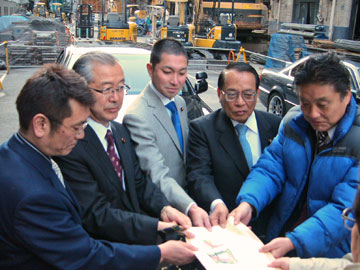 東京中央郵便局の工事現場を超党派の議連で視察し要請書を手渡す