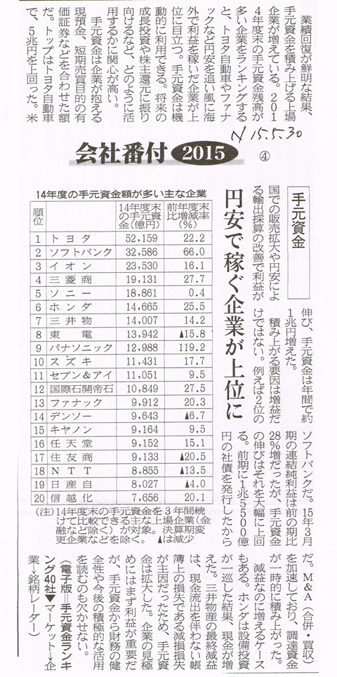 【15.05.30】手元資金の多い会社のランキング(「日経」コラム)