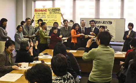 全国から駆けつけた参加者から、「子育てと教育」(8万3333人)、「社会保障の充実」(8万216人)など、あわせて25万7476人分の請願書を受け取りました。